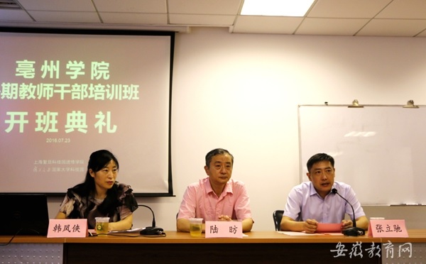 7月23日,亳州学院暑期干部、骨干教师培训班开班仪式在复旦大学国家科技园进修学院举行。复旦大学副校长陆昉,亳州学院校领导张立驰、丁凌、周明、李长花、刘可出席开班仪式。复旦大学科技园进修学院培训部主任韩凤侠主持开班仪式。
