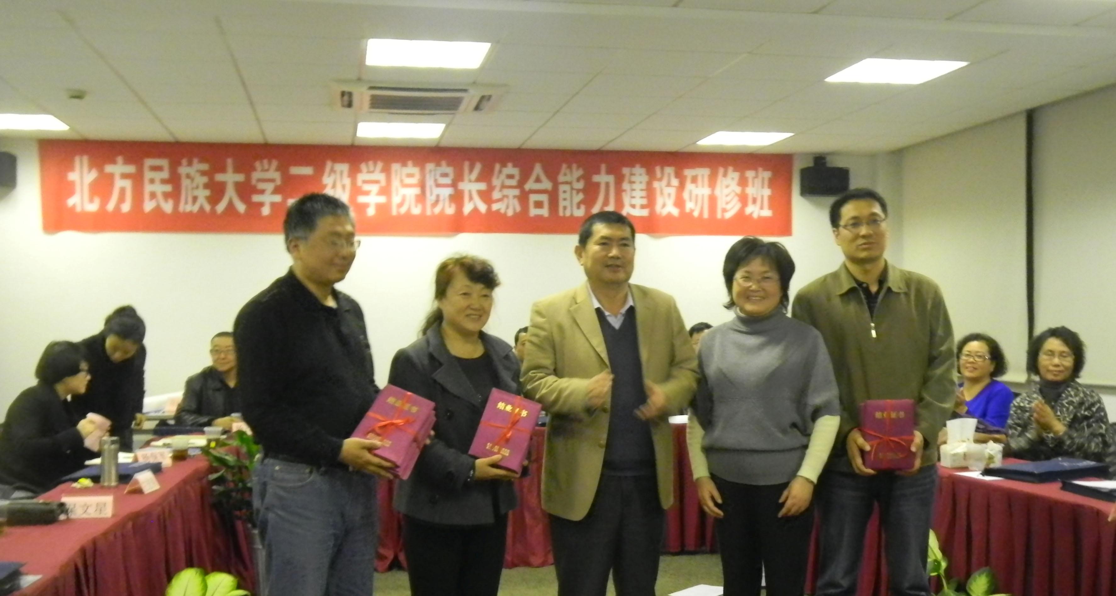 为有效提升二级学院院长等中坚领导干部的办学能力、管理能力,进一步激活思路、激发办学热情,开阔视野,实现二级学院办学实体化,逐步推进教育教学改革和人才培养。2012年11月10—14日,我院受北方民族大学委托,成功举办了为期5天的“二级学院院长综合能力建设研修班”。