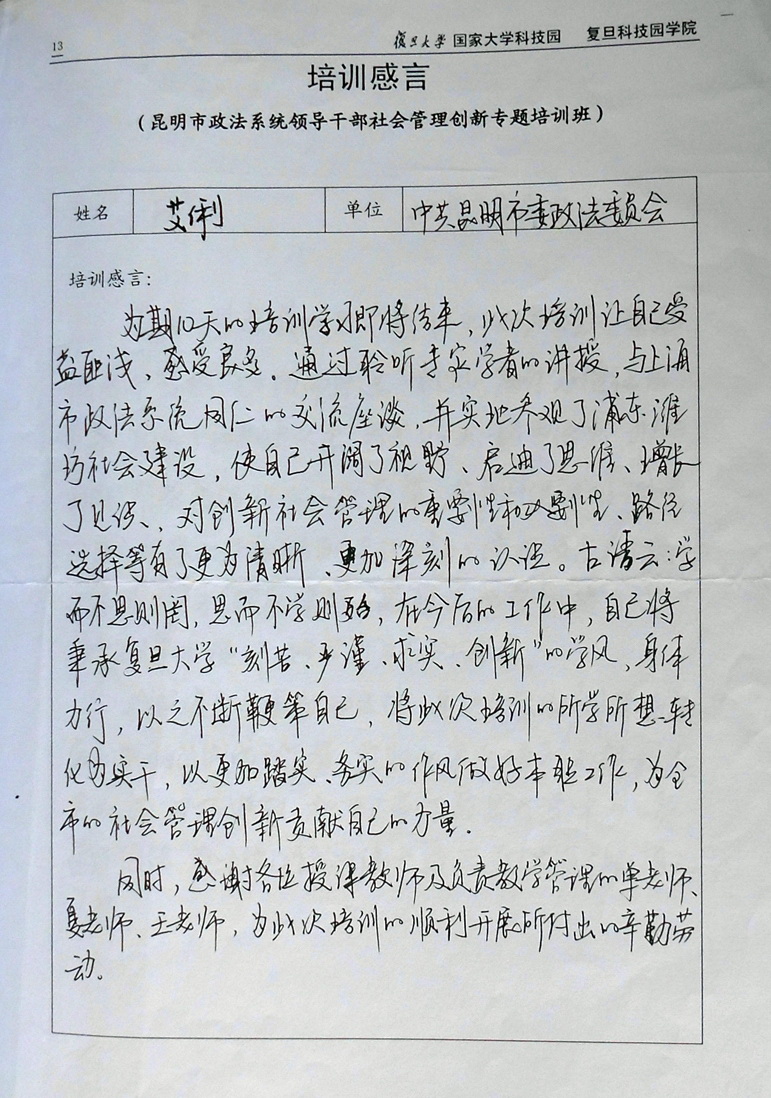 昆明市政法委艾俐同志感言